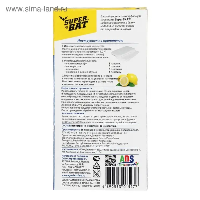 Пластины от моли SuperBAT надежно защитят в быту изделия из шерсти и меха от повреждений молью.Инструкция по применению: извлеките необходимое количество пластин из пакетиков и поместите в средней части объема хранения 1 м. куб. (величина среднего платяного шкафа) или местах возможного появления моли. Рекомендуется использовать: в платяном шкафу, на антресолях, в чемодане, в коробке с зимней обувью. Пластина эффективна в течение 6 месяцев с момента извлечения из упаковки. Пластины можно перемещать в разные места в течение срока их действия.Меры предосторожности: использовать только по назначению! Не для пищевых целей! В помещении площадью не более 15 кв.м. использовать не более 2-х пластин. Использовать средство отдельно от пищевых продуктов, в местах, недоступных для детей и домашних животных. Избегать попадания прямых солнечных лучей на открытую упаковку с пластинами. Использованное средство утилизировать как бытовые отходы. После проведения обработки вымыть руки с мылом.Действующее вещество: выпортрин (d- эмпентрин) 30 мг/пластина.