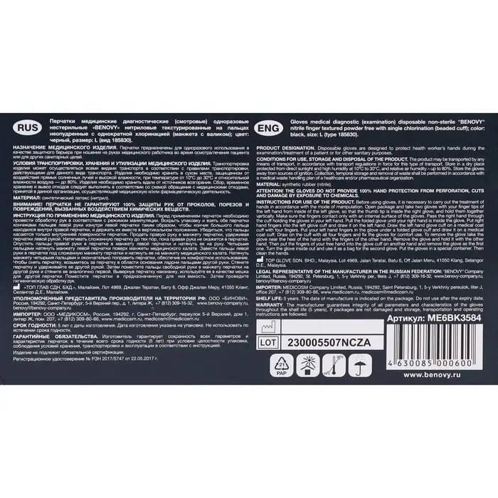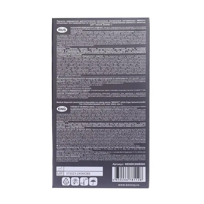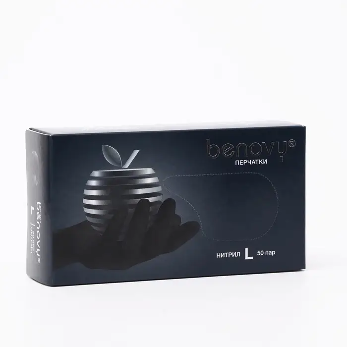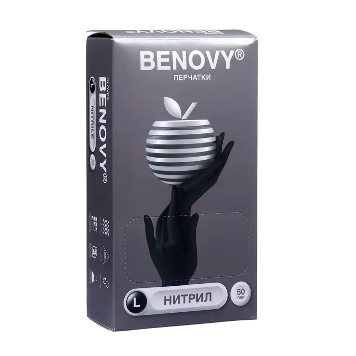 Медицинские перчатки BENOVY, нитриловые, нестерильные, текстурированные на пальцах, черные, размер L, 50 пар
