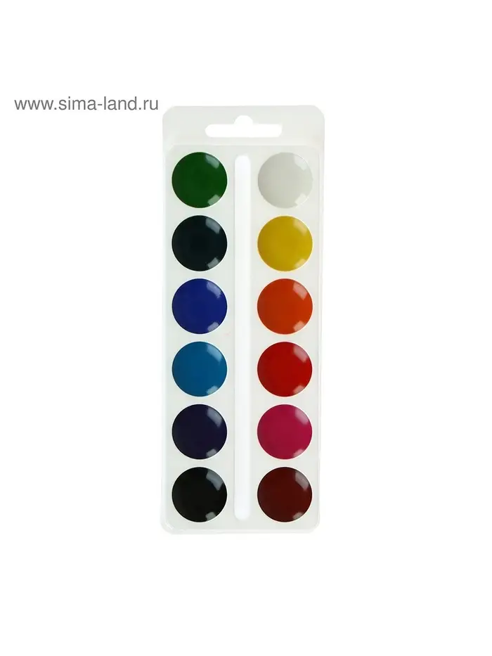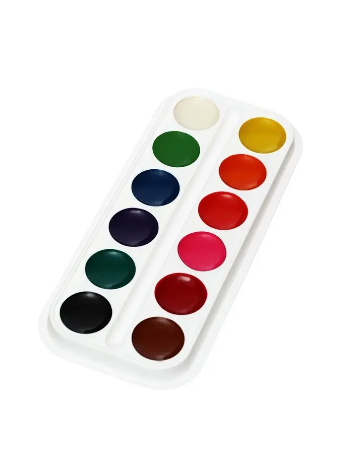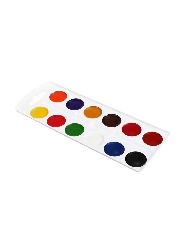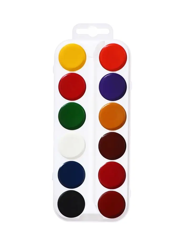 Набор акварельных красок в картонной упаковке. Включает 12 насыщенных цветов, подходит для творчества, обучения и художественных экспериментов. Удобный формат и качественная пигментация делают набор универсальным выбором для детей и взрослых.