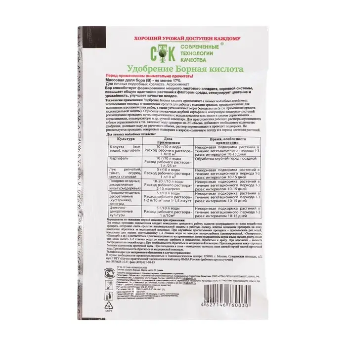 Борная кислота "СТК" - легко усваиваемое растениями химическое соединение бора, повсеместно и успешно применяемое на огородных участках.