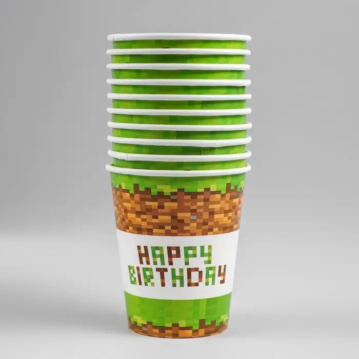 Стакан одноразовый бумажный "С днём рождения" пиксели, набор 6 шт, 250 мл