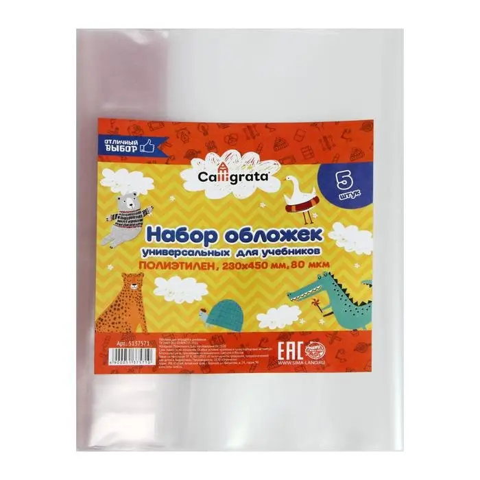 Набор обложек ПЭ 5 штук, 230 х 450 мм, 80 мкм Calligrata, для учебников, универсальные