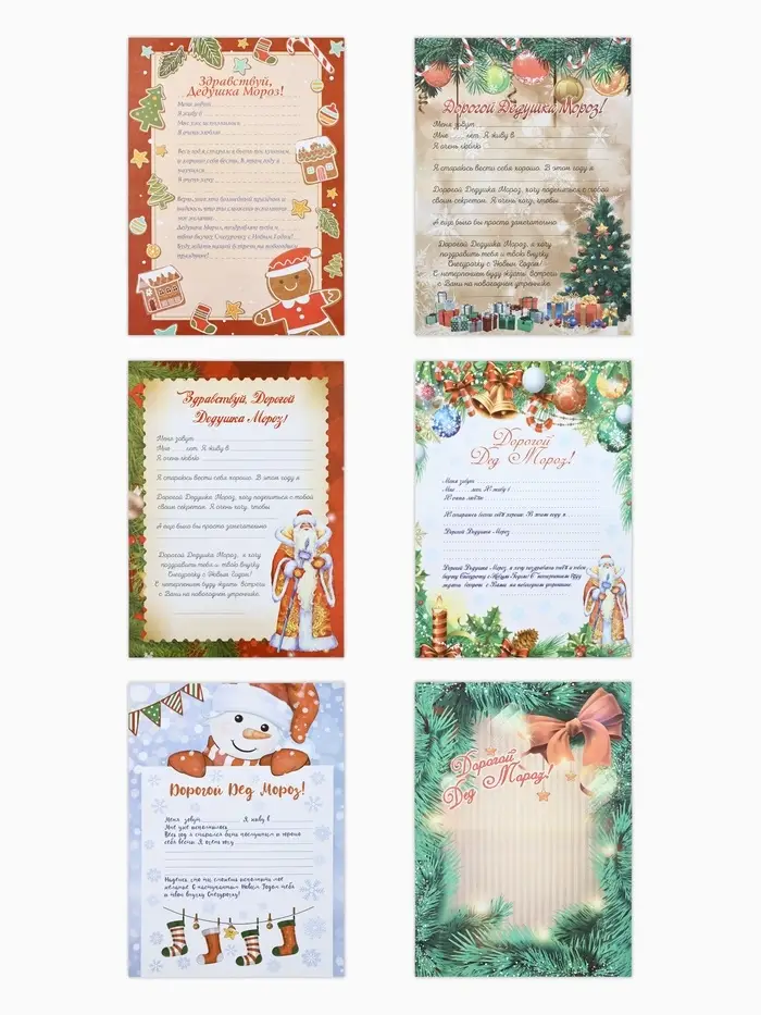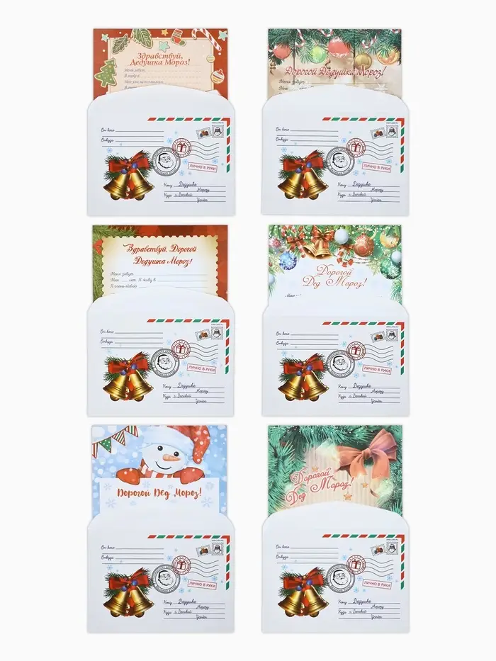 В комплект входит 6 писем формата А4 и 6 конвертов размером 23 × 16 см. Дизайн и текст у всех писем из набора будет разным, а конверты одинаковые.