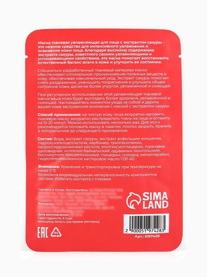 Маска тканевая увлажняющая для лица с экстрактом сакуры