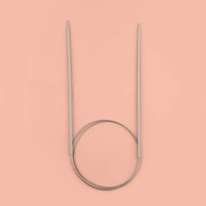 Круговые спицы представляют собой две металлические части, соединённые друг с другом тросиком. Инструмент незаменим при вязании полотна по кругу. С его помощью получаются изделия без дополнительных швов: шапки, рукава и горловины.