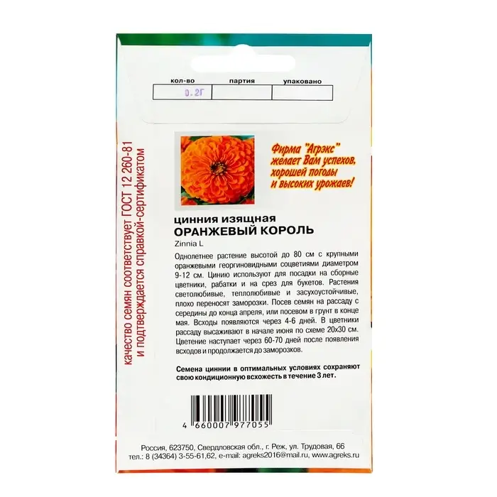 Семена цветов однолетние Цинния Оранжевый король 0,2