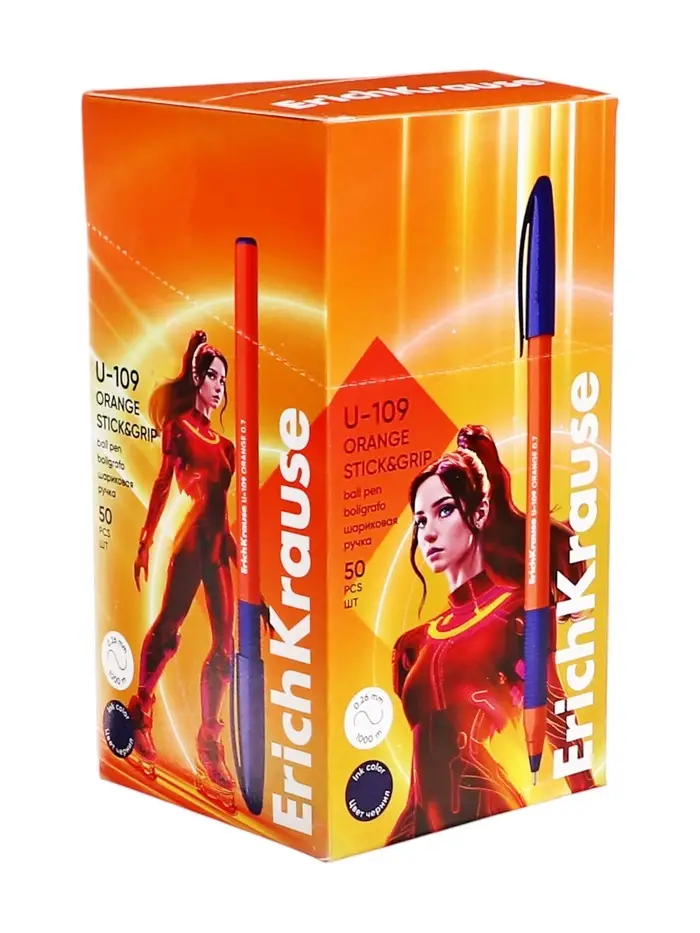 Ручка шариковая ErichKrause U-109 Orange Stick&Grip, игольчатый узел 1.0 мм, чернила синие, резиновый держатель, супермягкое письмо