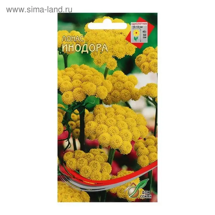 Однолетнее растение высотой 45-50 см. Стебли прямостоячие, жесткие, сильноветвистые. Листья глубоко разрезанные, серебристые. Некрупные соцветия собраны в плотные щитковые соцветия до 10-12 см в поперечнике. Лонас можно использовать при посадках в невысоких цветниках. Прекрасно это растение смотрится в рокариях. Также лонас используют как сухоцвет.