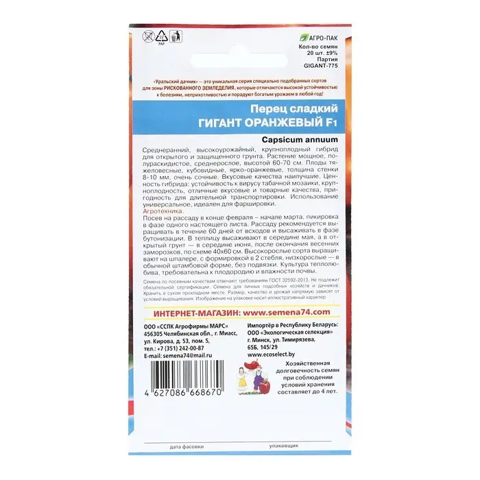 Семена Перец сладкий "Гигант", оранжевый, F1, 20 шт
