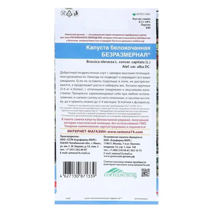 Семена Капуста белокочанная "Безразмерная", 0,3 г