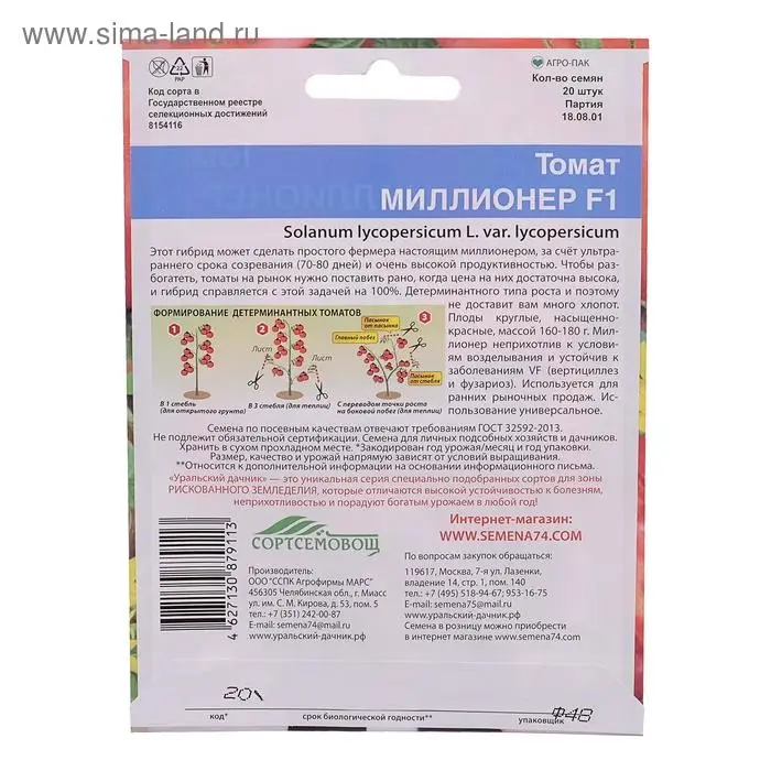 Семена Томат "Миллионер", F1,детерминантный,низкорослый 20 шт