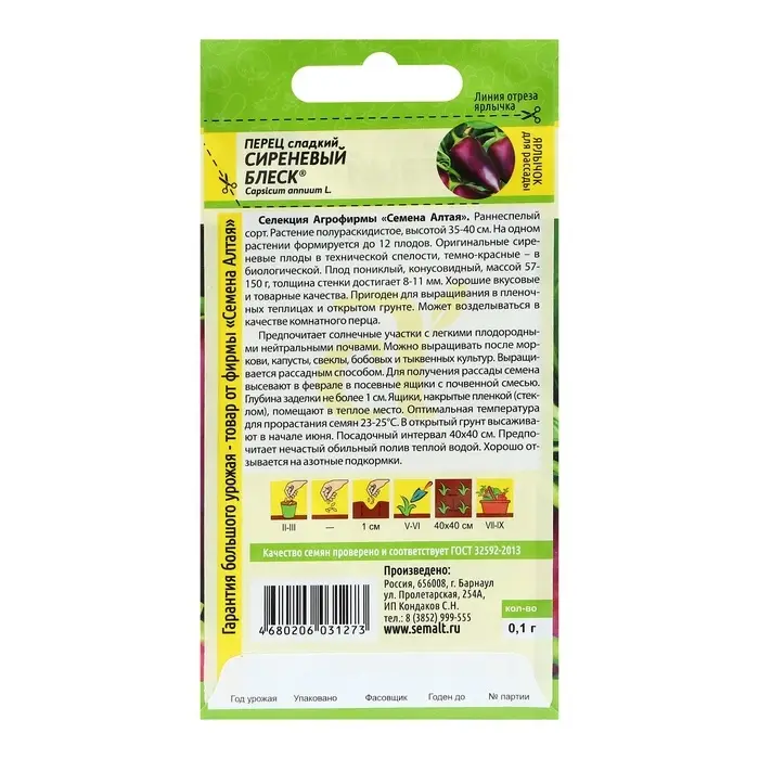 Селекция Агрофирмы «Семена Алтая». Раннеспелый сорт. Растение полураскидистое, средней высоты. Оригинальные сиреневые плоды в технической спелости, темно-красные – в биологической. Плод пониклый, конусовидный, массой 57-150 г. Хорошие вкусовые и товарные качества. Пригоден для выращивания в пленочных теплицах и открытом грунте. Можно выращивать после моркови, капусты, свеклы, бобовых (кроме фасоли) и тыквенных культур. Перец нельзя размещать рядом с огурцом.