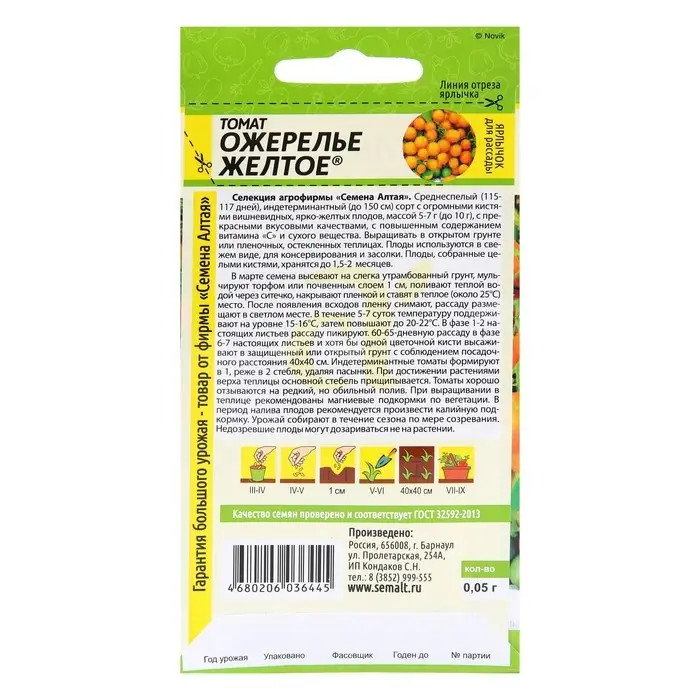 Сорт селекции Агрофирмы «Семена Алтая». Среднеспелый (115-117 дней), индетерминантный (до 150 см) сорт с огромными кистями вишневидных, ярко-желтых плодов, массой 5-7 г (до 10 г), с прекрасными вкусовыми качествами, с повышенным содержанием витамина «С» и сухого вещества.