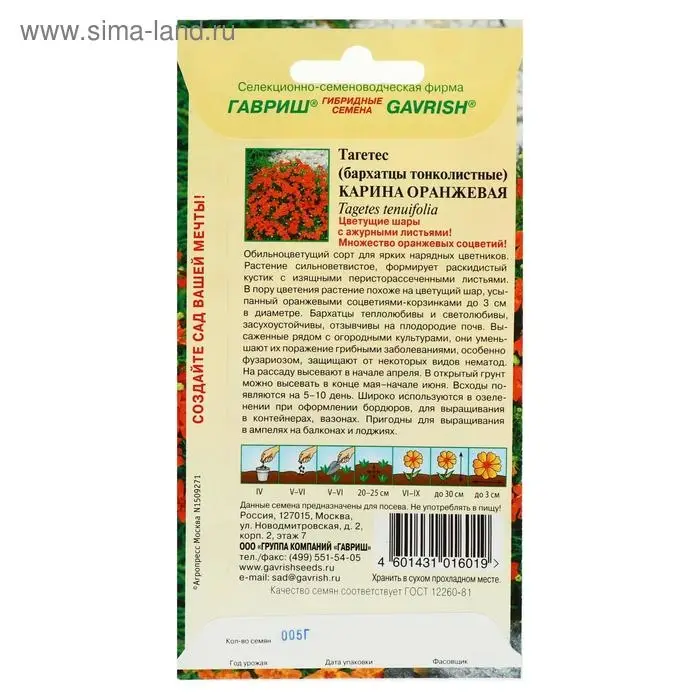 Обильно цветущий сорт для ярких нарядных цветников. Растение сильноветвистое, формирует раскидистый кустик с изящными перисто-рассеченными листьями. В пору цветения растение похоже на цветущий шар, усыпанный оранжевыми соцветиями – корзинками до 3 см в диаметре. Бархатцы теплолюбивы и светолюбивы, засухоустойчивы, отзывчивы на плодородие почв. Высаженные рядом с огородными культурами, они уменьшают их поражение грибными заболеваниями, особенно фузариозом, защищают от некоторых видов нематод. На рассаду высевают в начале апреля. В открытый грунт можно высевать в конце мая — начале июня. Всходы появляются на 5-10 день. Широко используются в озеленении при оформлении бордюров, для выращивания в контейнерах, вазонах. Пригодны для выращивания в ампелях на балконах и лоджиях.