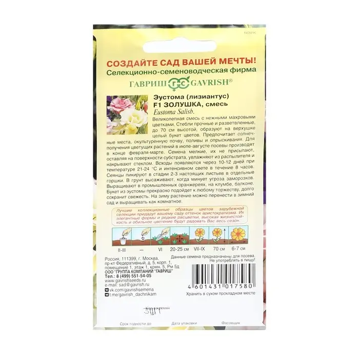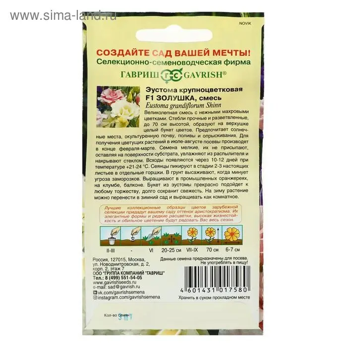 Великолепная смесь однолетних гибридных сортов с нежными махровыми цветками. Стебли прочные и разветвленные, до 50 см высотой, образуют на верхушке целый букет цветов. Предпочитает солнечные места, окультуренную почву, поливы и опрыскивания. Для получения цветущих растений в июле-августе посевы производят в конце февраля -марте. Семена мелкие, их не присыпают, оставляя на поверхности субстрата, увлажняют из распылителя и накрывают стеклом. Всходы появляются через 10-12 дней при температуре +21-24 о С. Сеянцы пикируют в стадии 2-3 настоящих листьев в отдельные горшки. В грунт высаживают, когда минует угроза заморозков. Выращивают в промышленных оранжереях, на клумбе, на балконе. Букет из эустомы прекрасно подойдет к любому торжеству, долго сохранит свежесть. На зиму растения можно перенести в зимний сад и выращивать как комнатное растение.