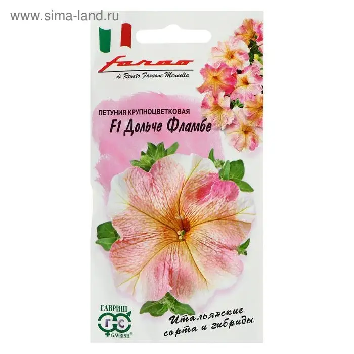 Крупноцветковые гибриды из итальянской серии "Дольче" славятся невероятно нежными пастельными оттенками, редко встречающимися среди петуний. Из-за неравномерного окрашивания (тона переходят из более насыщенных и плотных в более светлые и легкие) цветки кажутся воздушными, полупрозрачными, будто сияют, пропуская солнечный свет. Эффект усиливает ярко-выраженное жилкование, интенсивность которого меняется от цветка к цветку. Растение образует аккуратные кустики высотой 20-30 см, усыпанные нежно-розовыми цветками с желтым центром и белым ободком диаметром 7-8 см. Гибриды неприхотливы, обильно цветут и даже в ненастную погоду сохраняют свою привлекательность. Посев проводят поверхностно, под стекло, с февраля по март. После появления всходов стекло убирают. При зимнем посеве всходам необходима подсветка. Всходы появляются через 7-12 дней. На постоянное место высаживают, когда минует опасность заморозков. Цветет с конца мая весь сезон. Светолюбива и достаточно засухоустойчива. Предпочитает легкие, плодородные, хорошо дренированные почвы. Украсит клумбы, вазоны, балконные ящики, подоконники, низкорослые бордюры. Рекомендуется для профессионального озеленения и выращивания на продажу.