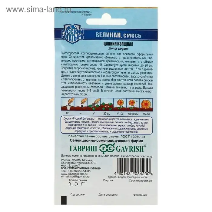 Семена цветов Цинния "Великан", ц/п, смесь, серия Русский богатырь, 0,3 г