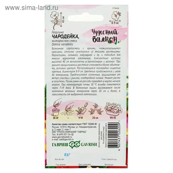 Семена цветов Георгина "Чародейка", ц/п, смесь, серия Чудесный балкон, 0,3 г