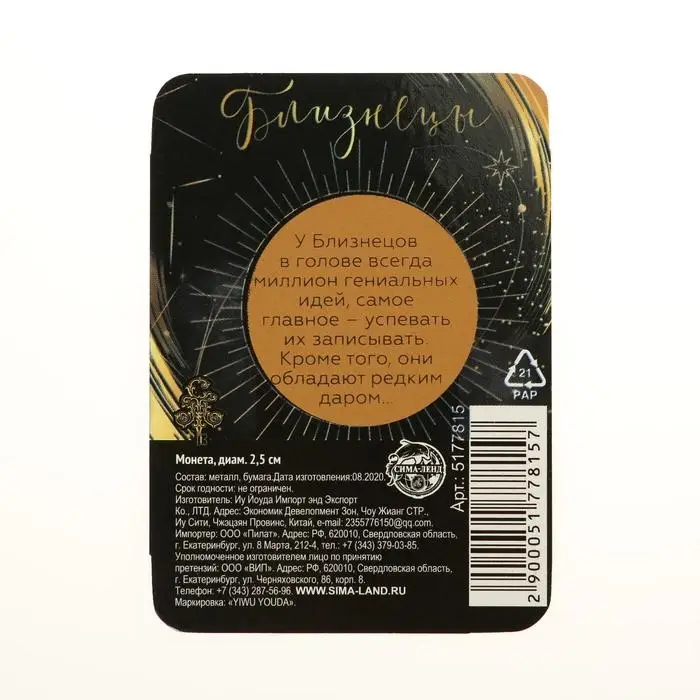 Монета сувенир знак зодиака «Близнецы», d=2,5 см.
