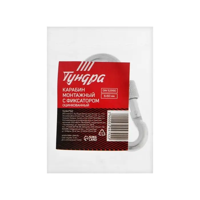 Карабин монтажный с фиксатором ТУНДРА krep, DIN5299D, 6×60 мм, оцинкованный, 1 шт.