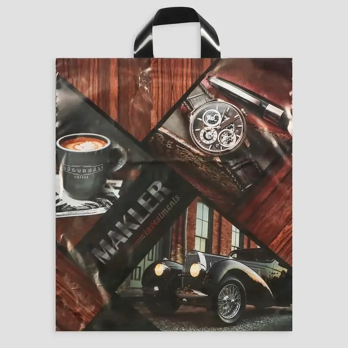 Пакет полиэтиленовый с петлевой ручкой, прочный с оригинальным рисунком.