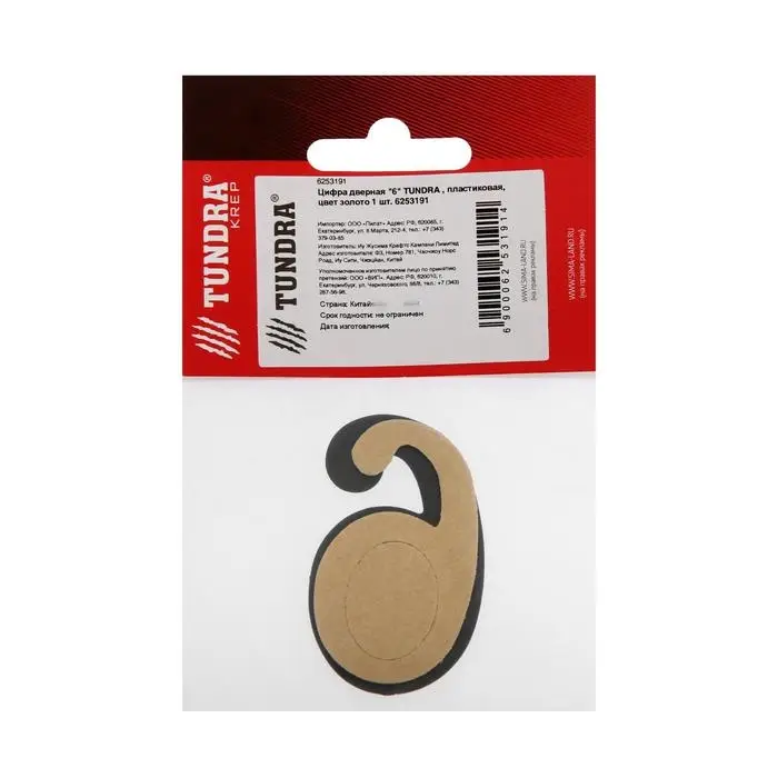 Цифра дверная 6 ТУНДРА, пластиковая, цвет золото 1 шт.