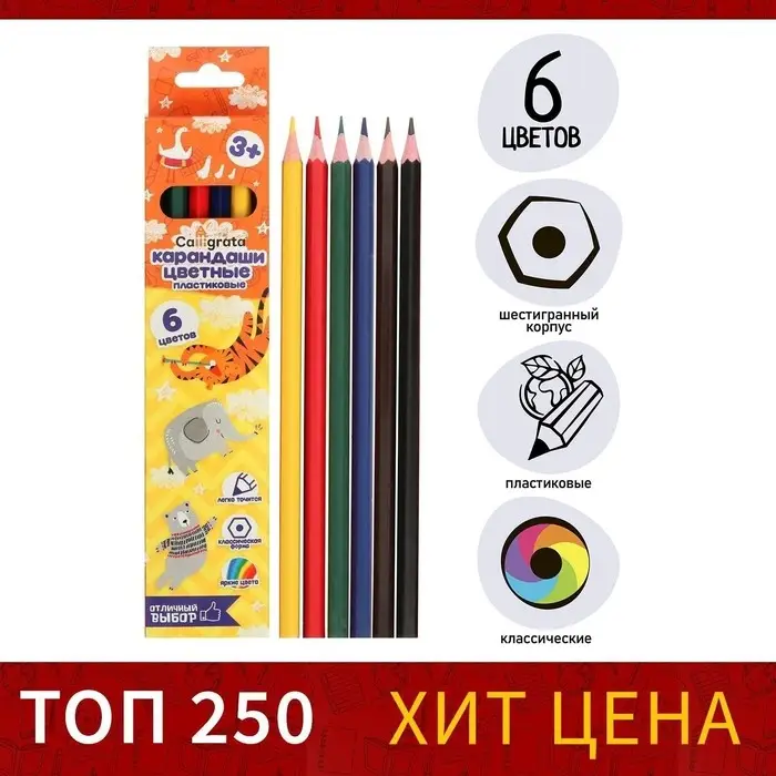 - Набор цветных карандашей бюджетной ценовой категории, 6 цветов, стандартный средней жесткости грифель.