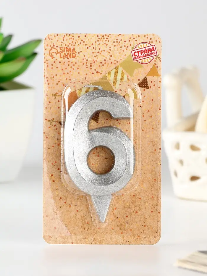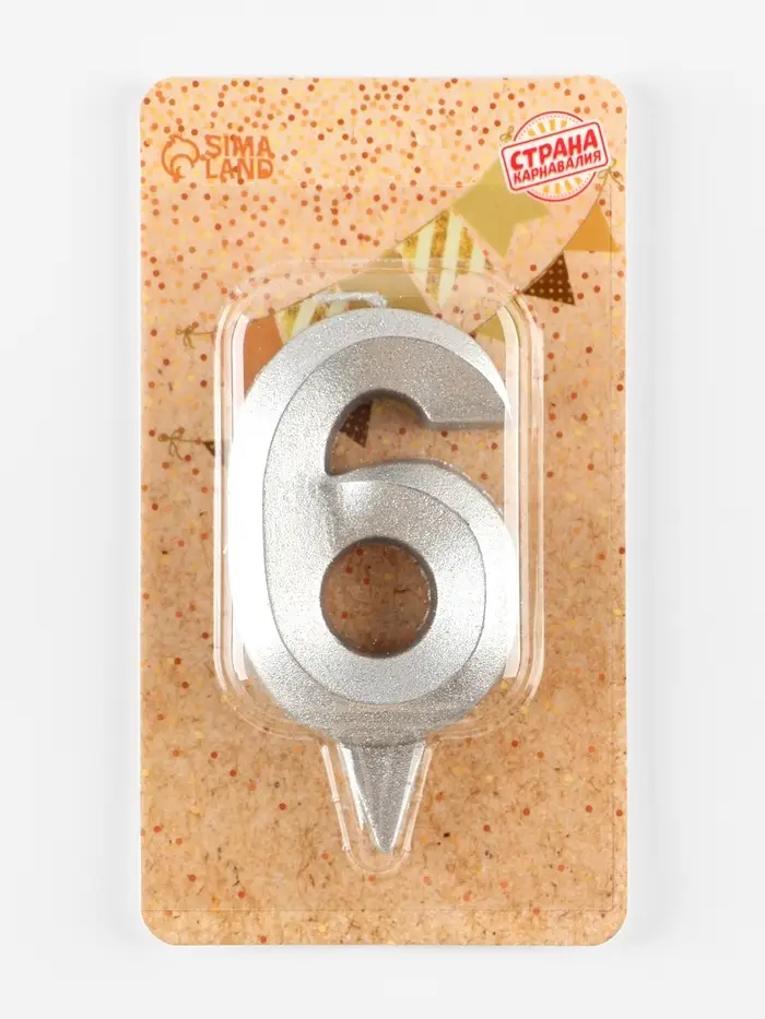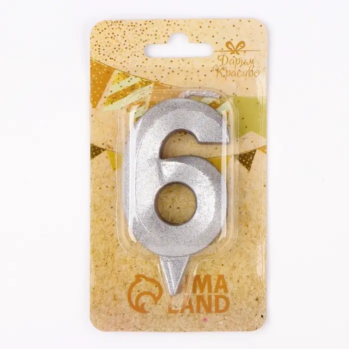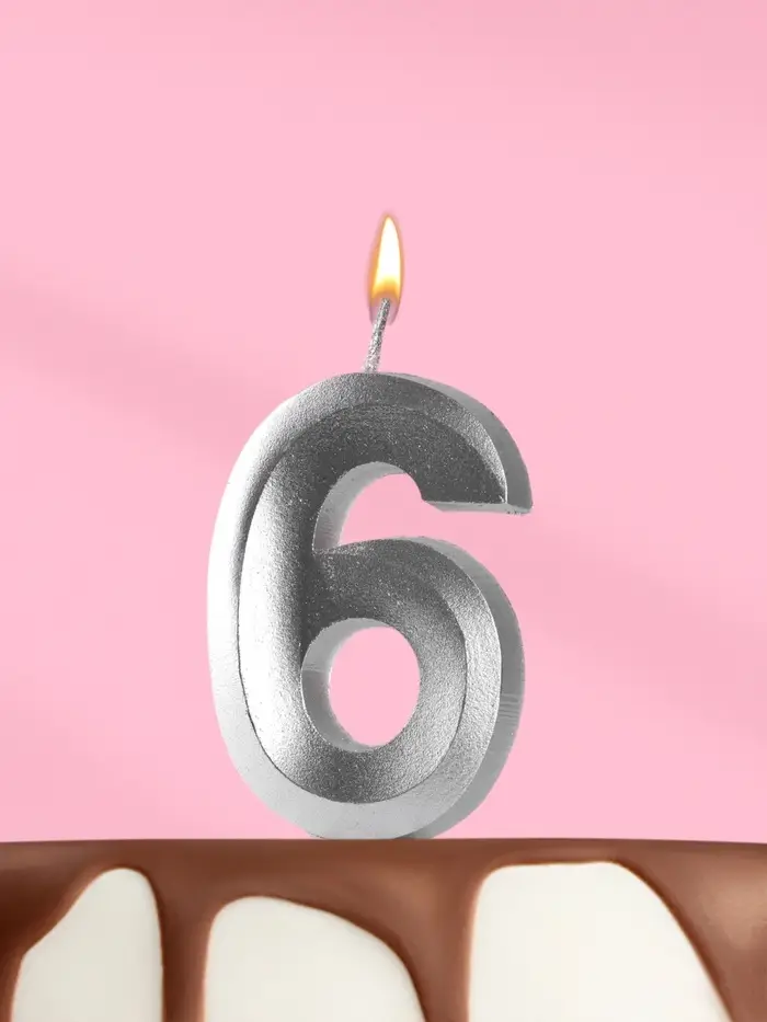 Свеча в торт «Цифра 6», серебряная, 6.5 см