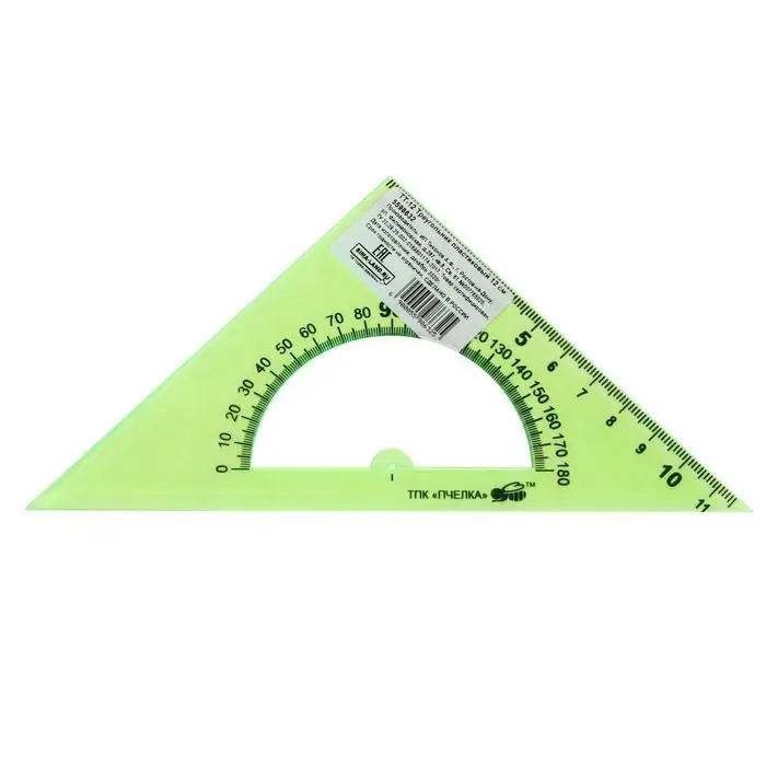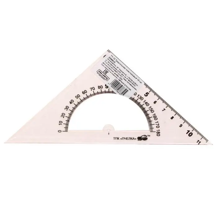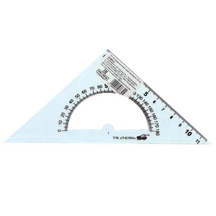 Изготовлен из прочного прозрачного пластика толщиной 2 мм. Длина шкалы - 12 см, угол - 45°, транспортир - 180°. обладает четкой разметкой, что делает его удобным в использовании. Упакован в блистер с европодвесом.