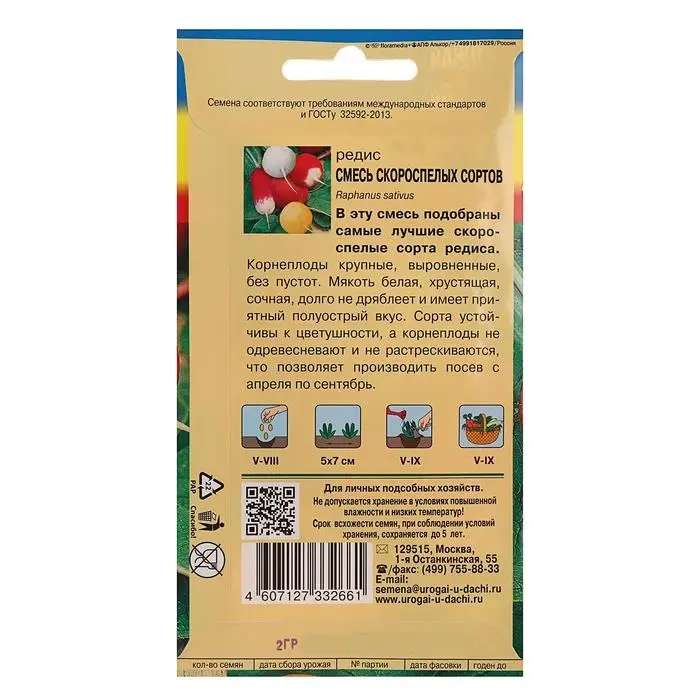 В эту смесь подобраны самые лучшие скороспелые сорта редиса. Корнеплоды крупные, выровненные, без пустот. Мякоть белая, хрустящая, сочная, долго не дряблеет и имеет приятный полуострый вкус. Сорта устойчивы к цветушности, а корнеплоды не одревесневают и не растрескиваются, что позволяет производить посев с апреля по сентябрь.