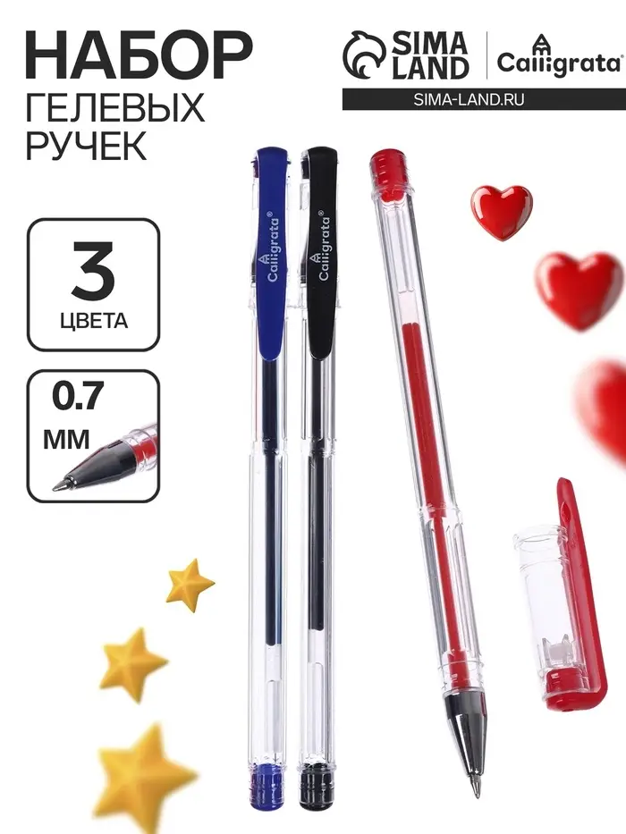 Набор гелевых ручек 3 цвета, стержень синий, красный, черный, корпус прозрачный