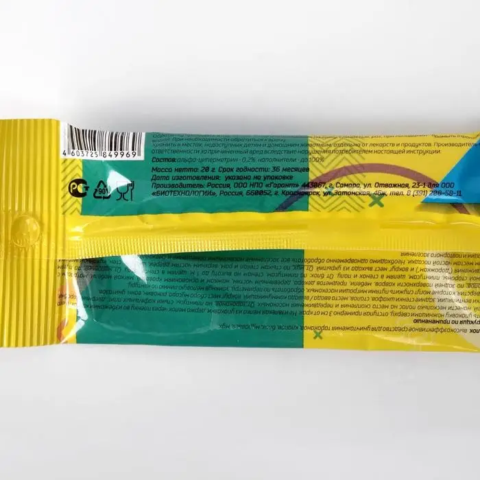 Способ применения: вскрыть упаковку ножницами сверху, отступая примерно 3 см от края. Не извлекая мелка из упаковки, держа мелок через пленку во избежание контакта с кожей, нанести несколько полос на место скопления и передвижения насекомых. Необходимо одновременно обработать все заселенные насекомыми помещения и смежные с ними для предотвращения миграции и повторного заселения.