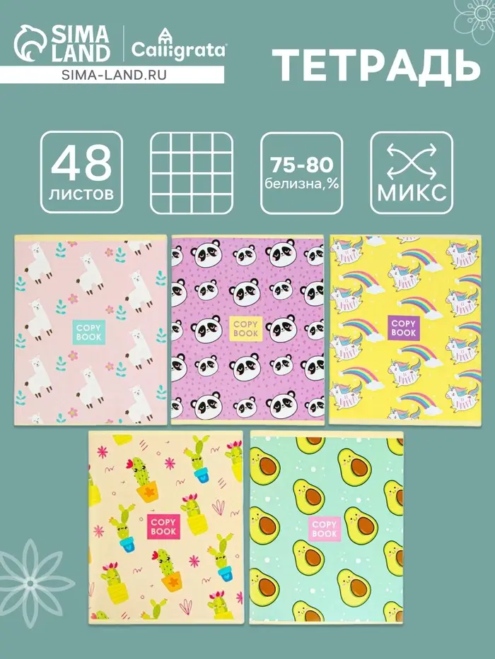 Комплект тетрадей из 5 штук, 48 листов в клетку Calligrata "Любимые питомцы", обложка мелованная бумага, блок №2, белизна 75% (серые листы)