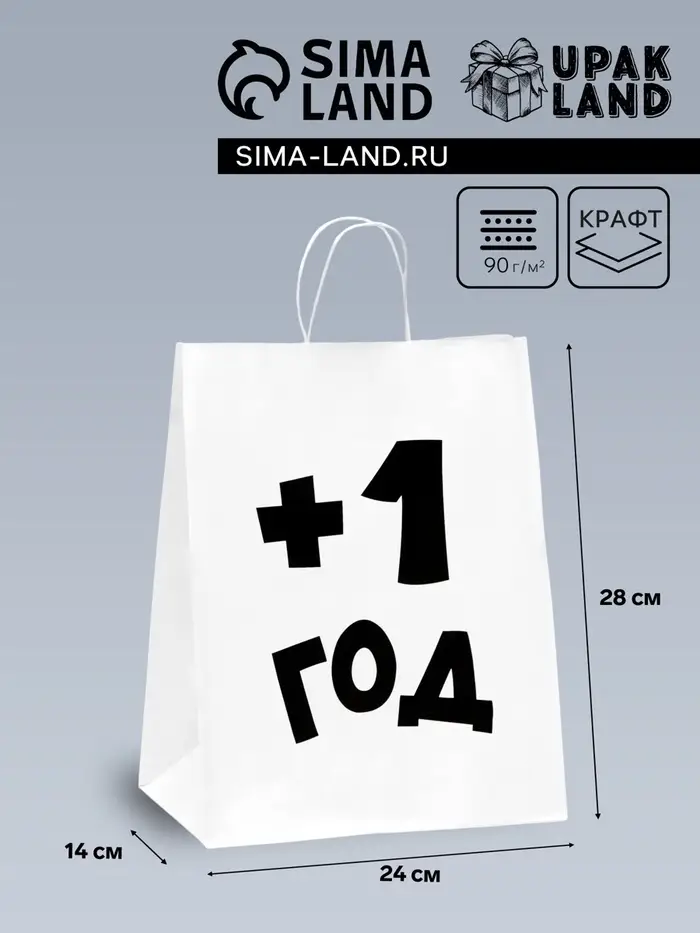 Подарок с юмором для именинников! Крафт-пакет «Плюс один год» — оригинальная упаковка для тех, кто умеет смеяться над возрастом. Плотная крафт-бумага 90 г/м² с кручёным шпагатом выдерживает до 3 кг, а игривая надпись добавит позитива вашему поздравлению.