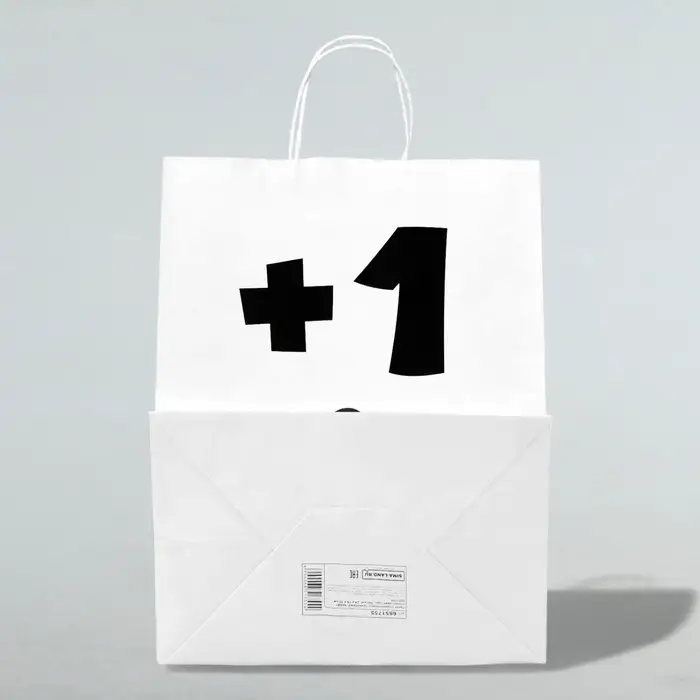 - Стильный минимализм: Чистый белый фон с чёткими надписями выглядит современно. Двустороннее оформление делает пакет презентабельным с любого ракурса.