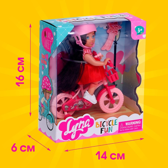 Высота куклы: 11 см. В комплекте есть велосипед и шлем. С ними сюжетов для весёлой игры будет больше.