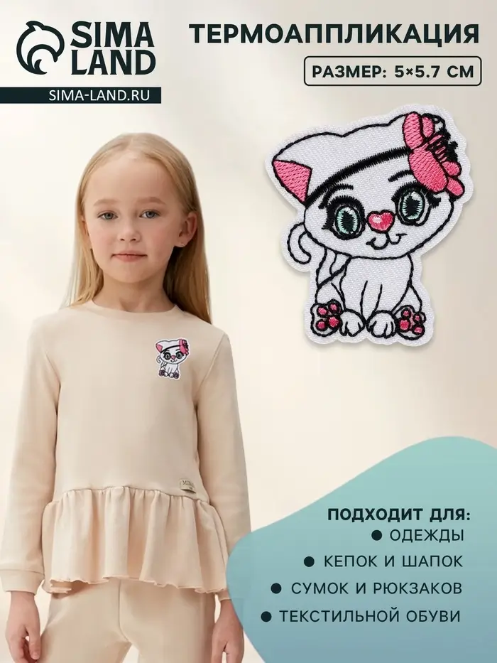 Пусть текстильная аппликация с милой кошкой и нежным цветком станет ярким акцентом в образе вашей девочки. Это универсальное украшение для детской одежды и аксессуаров — подходит как для творческих проектов, так и для лёгкого декора.