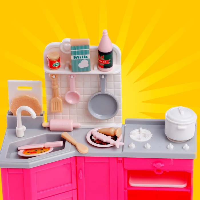 В комплекте уголок маленькой хозяюшки. Кухонный гарнитур с посудой и продуктами питания.