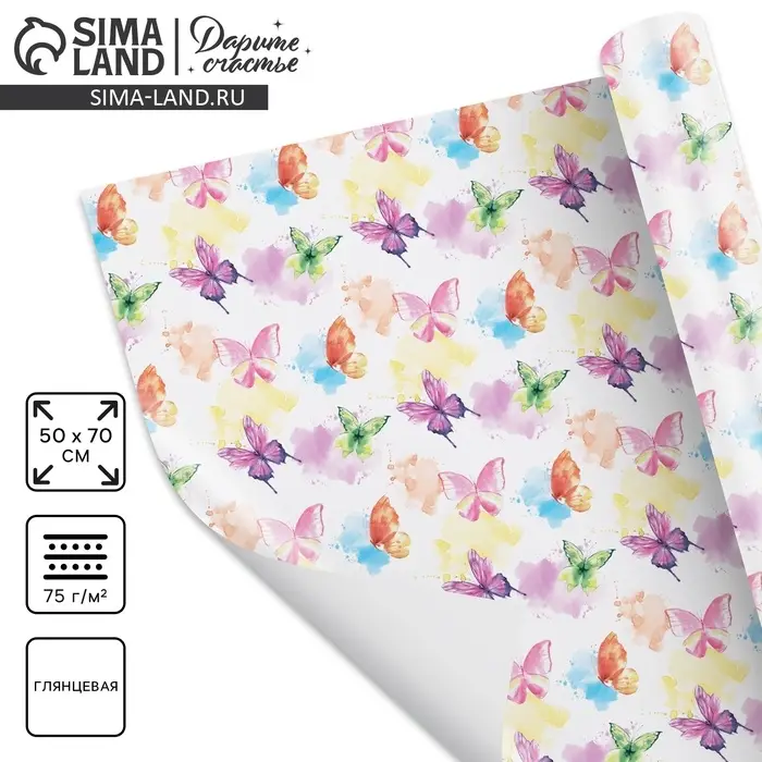 Бумага упаковочная глянцевая «Акварельные бабочки», 50 х 70 см