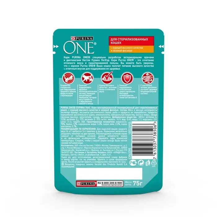 Влажный корм Purinа One для стерилизованных кошек, курица/фасоль, 75 г