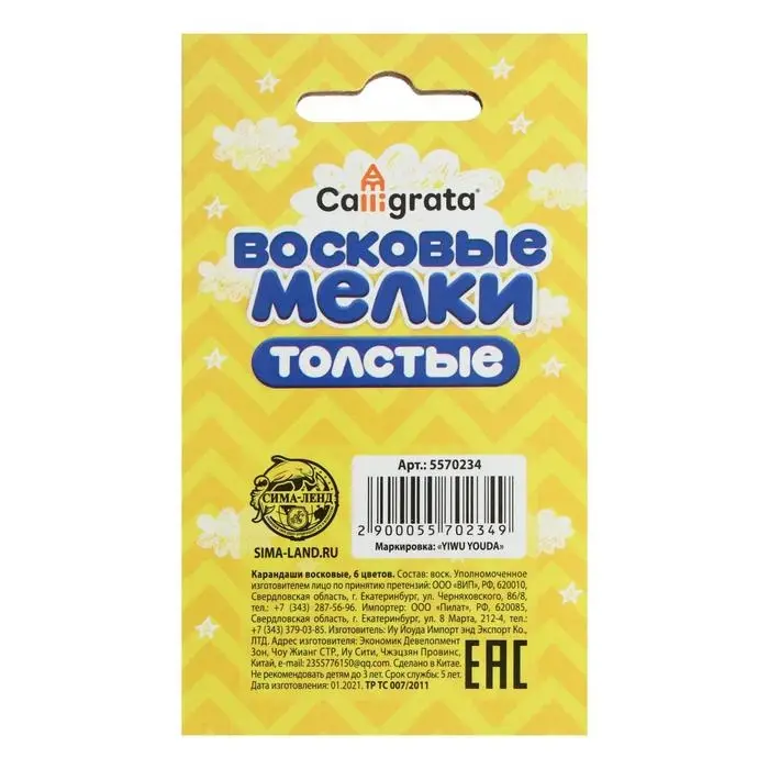 Мелки восковые 6 цветов, утолщённые, 93×11 мм, Calligrata, в картонной коробке