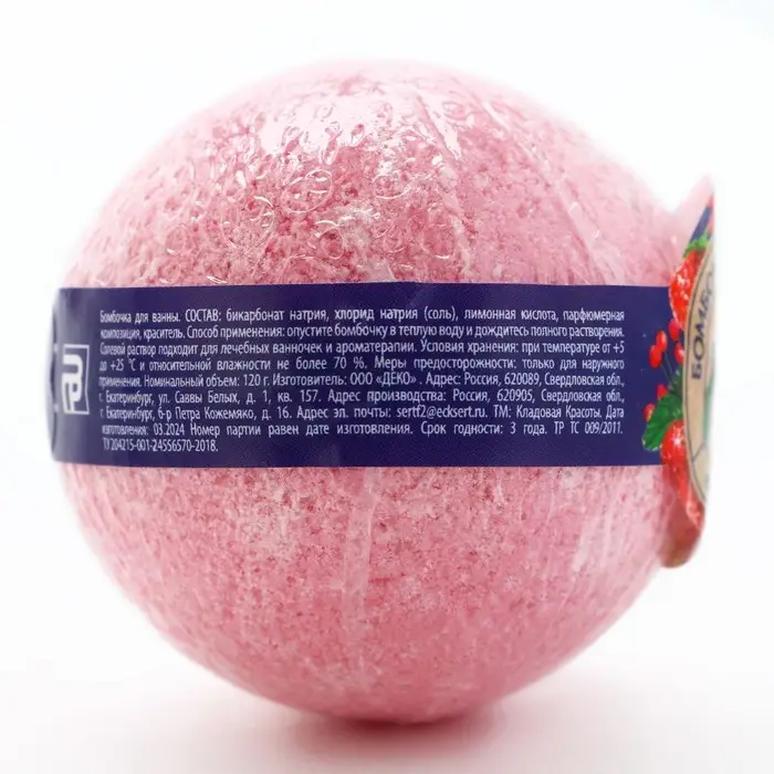 Бомбочка для ванны, 120 г, аромат клубники, КЛАДОВАЯ КРАСОТЫ