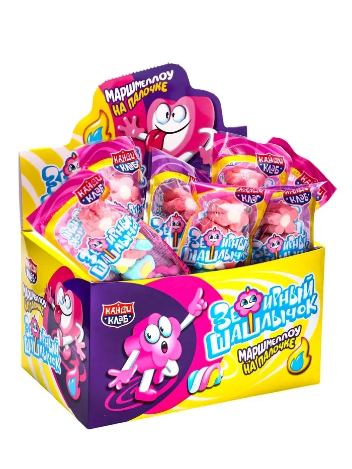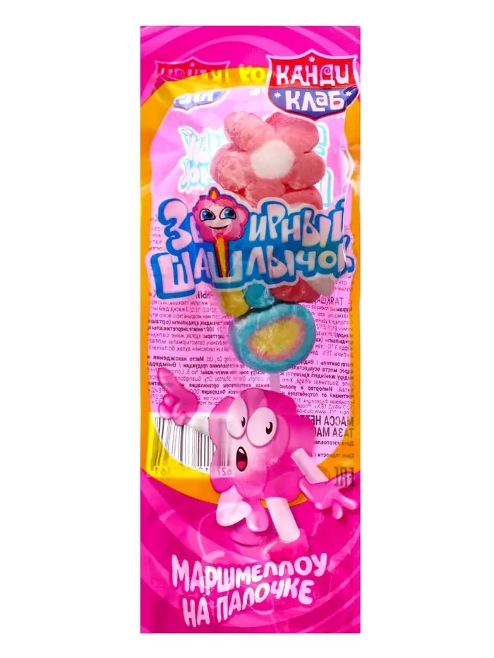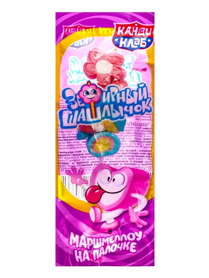 Зефирный шашлычок - это лакомство, которое представляет собой маленький зефир, который размещен на пластиковой палочке. Вес одного зефирного шашлычка составляет 12 грамм.