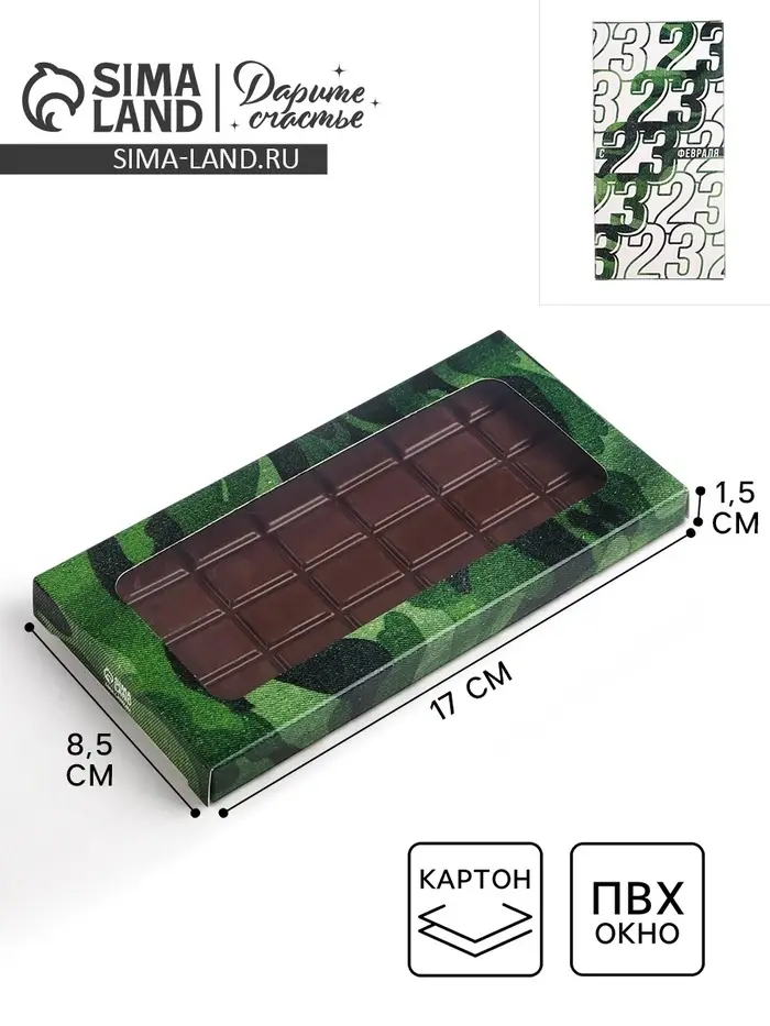 Коробка для шоколада, кондитерская упаковка, «23 февраля», с окном, 17.3 х 8.8 х 1.5 см