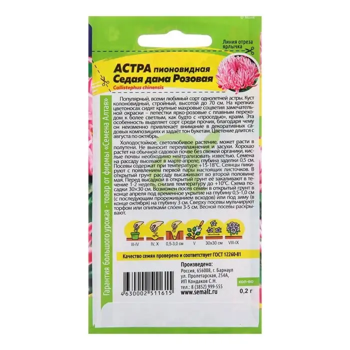 Популярный, всеми любимый сорт однолетней астры. Куст колоновидный, стройный, высотой до 70 см. На крепких цветоносах сидят крупные махровые соцветия замечательной окраски – лепестки ярко-розовые с плавным переходом к более светлым, как будто с «проседью», краям. Эта особенность выделяет сорт среди прочих, благодаря чему он неизменно привлекает внимание в декоративных садовых композициях и задаёт тон букетам. Цветение длится с августа по октябрь.Холодостойкое, светолюбивое растение, может расти в полутени. Не выносит переувлажнения и засухи. Хорошо растет на обычной садовой почве без свежей органики, кислые почвы необходимо нейтрализовать известью. Семена на рассаду высевают в марте-апреле, глубина заделки 0,5 см. Посевы содержат при температуре +15-18°С. Сеянцы пикируют с появлением первой пары настоящих листочков. В открытый грунт рассаду высаживают во второй половине мая. Перед высадкой в открытый грунт её закаливают в течение 1-2 недель, снизив температуру до +10°С. Схема посадки 3030 см. Возможен посев семян в открытый грунт в конце апреля под временное укрытие на глубину 0,5-1,0 см (с последующим прореживанием всходов), или под зиму (в конце октября) на глубину 3 см. Сверху посевы мульчируют торфом или опилками слоем 3-5 см. Весной посевы раскрывают.