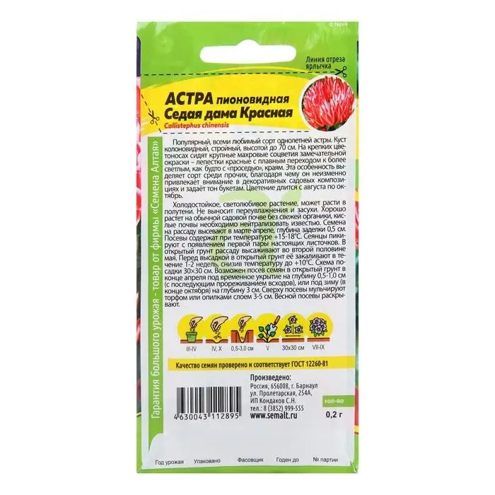 Популярный, всеми любимый сорт однолетней астры. Куст колоновидный, стройный, высотой до 70 см. На крепких цветоносах сидят крупные махровые соцветия замечательной окраски – лепестки красные с плавным переходом к более светлым, какбудто с «проседью», краям. Эта особенность выделяет сорт среди прочих, благодаря чему он неизменно привлекает внимание в декоративных садовых композициях и задаёт тон букетам. Цветение длится с августа по октябрь.Холодостойкое, светолюбивое растение, может расти в полутени. Не выносит переувлажнения и засухи. Хорошо растет на обычной садовой почве без свежей органики, кислые почвы необходимо нейтрализовать известью. Семена на рассаду высевают в марте-апреле, глубина заделки 0,5 см. Посевы содержат при температуре +15-18°С. Сеянцы пикируют с появлением первой пары настоящих листочков. В открытый грунт рассаду высаживают во второй половине мая. Перед высадкой в открытый грунт её закаливают в течение 1-2 недель, снизив температуру до +10°С. Схема посадки 3030 см. Возможен посев семян в открытый грунт в конце апреля под временное укрытие на глубину 0,5-1,0 см (с последующим прореживанием всходов), или под зиму (в конце октября) на глубину 3 см. Сверху посевы мульчируют торфом или опилками слоем 3-5 см. Весной посевы раскрывают.