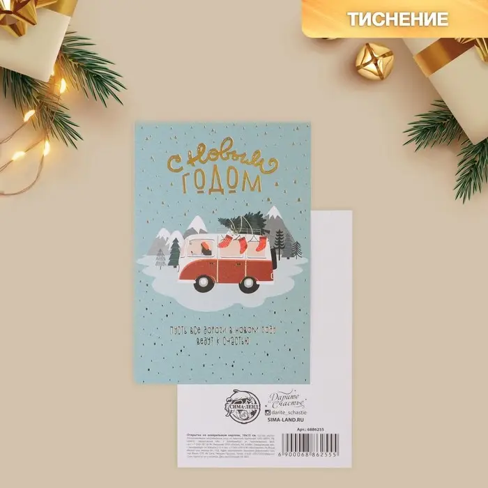 Открытка с новым годом на акварельном картоне «Дороги к счастью», тиснение, 10 х 15 см