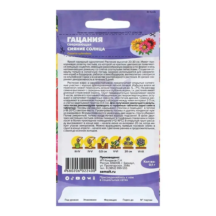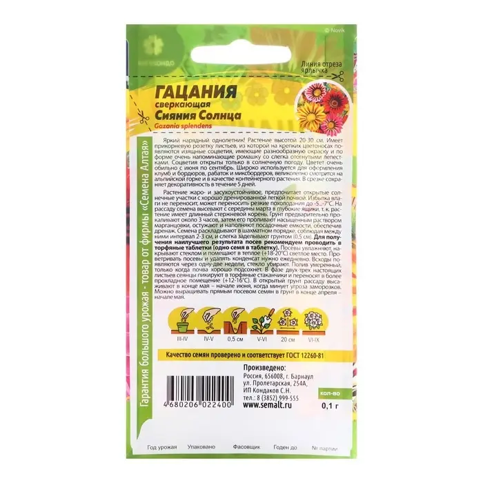 Семена цветов Гацания "Сияние солнца", Сем. Алт, ц/п, 0,1 г