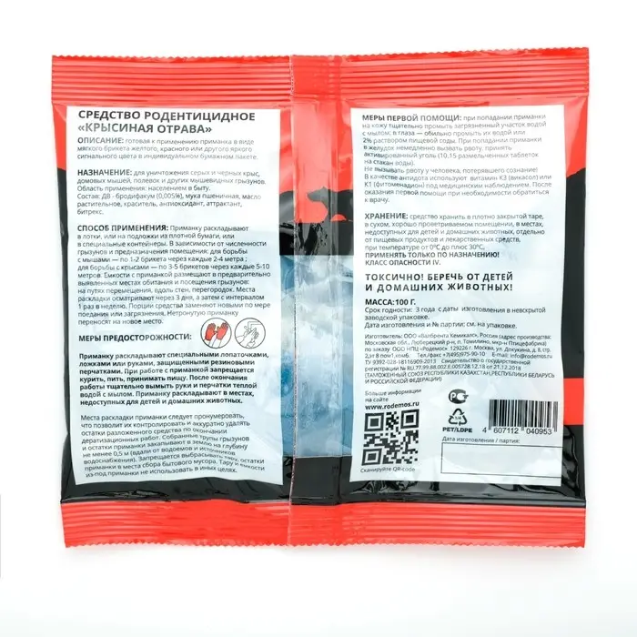 Готовая к применению приманки в виде мягкого брикета жёлтого, красного или другого яркого сигнального цвета в индивидуальном бумажном пакете для уничтожения серых и чёрных крыс, домовых, полевых мышей и других мышевидных грызунов. Пищевая отравленная приманка в виде мягких тесто-сырных брикетов - одна новых и наиболее эффективных форм приманок для борьбы со всеми видами грызунов внутри и вокруг жилых помещений, хозяйственных построек и на приусадебном участке. Действующее вещество данного средства обладает мумифицирующим эффектом, что позволяет вовремя ликвидировать тушки погибших грызунов до появления неприятного запаха.