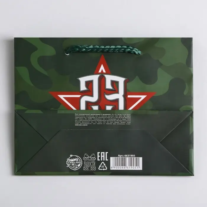 Пакет подарочный ламинированный, упаковка, «С 23 февраля», S 15 х 12 х 5.5 см